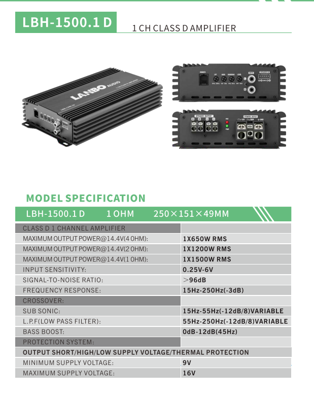 LBH-1500.1D 1500W Mono Class D Car Amplifier 1 Ohm Stable Subwoofer Power Amp