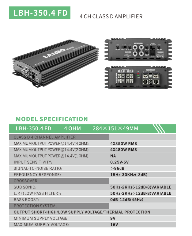 Professional 4 Channel Car Amplifier LBH-350.4FD Class D 350W x4 Full Range Power Amp