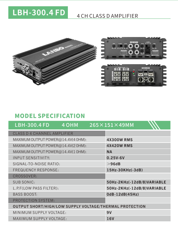 New LBH-300.4FD 4-Channel Class D Car Amp 300Wx4 RMS Compact Design High Efficiency