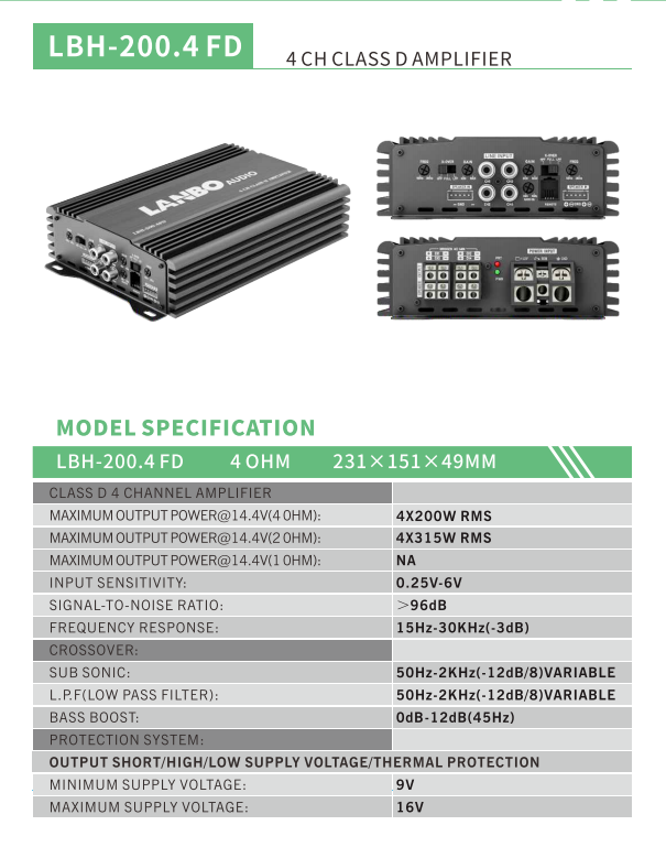High Power LBH-200.4FD 4 Channel Class D 200W×4 Car Amplifier With Bass Boost